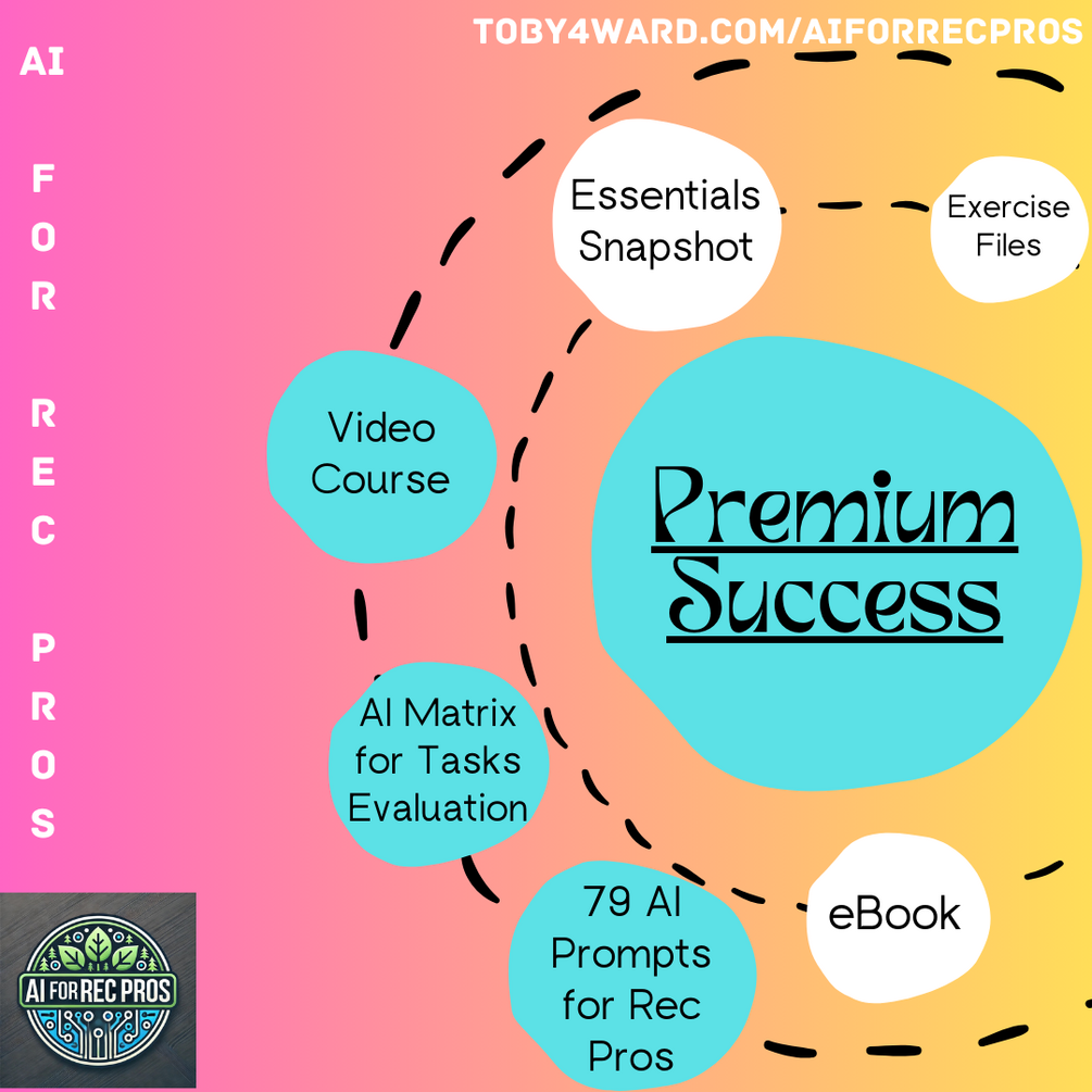 Everything in the Bare Necessities Package. Mega video course: An engaging visual guide that walks you through the book’s concepts step-by-step. AI Matrix for Task Evaluation: A specialized tool to help you identify which tasks in your workflow can be optimized using AI. Sample AI Prompts for Recreation Professionals: A set of actionable prompts to jumpstart AI use in day-to-day activities.
