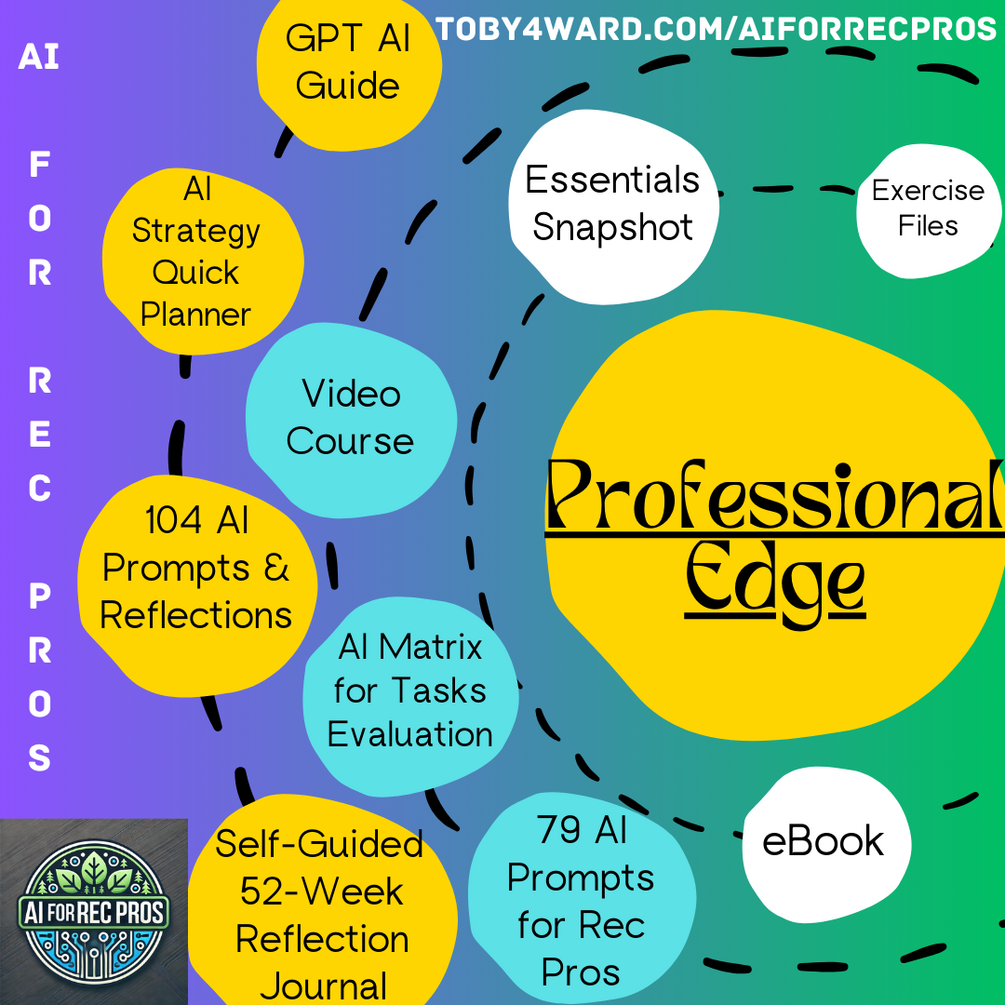 Step into leadership and mastery with the Professional Edge Package—the ultimate toolkit for making AI an integral part of your career. Save up to or more than two days a week and revolutionize your workflow with resources designed for continuous growth. With exclusive tools like the GPT AI-Guide and a year’s worth of action prompts, you’re equipped to lead, innovate, and maximize your impact in the recreation field. This tier is designed for those ready to go beyond learning and take action with strategic AI integration.